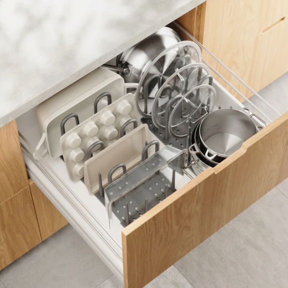 - Špajza / kuchyňa: Ideálne sú drôtené police – umožňujú cirkuláciu vzduchu a uľahčujú čistenie rozliatych látok. Pridajte vložky do políc pre malé predmety.